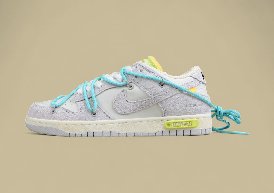 Der Nike SB Dunk Low “The 50” Off-White ist Teil von Virgil Ablohs visionärer Kollaboration mit Nike, die Sneakerkultur und High-Fashion auf unverwechselbare Weise verbindet. Diese Replika orientiert sich detailgetreu am Konzept der limitierten Serie, bei der jedes Paar mit einzigartigen Farbakzenten, Materialien und individuellen Nummern versehen wurde. Das Obermaterial besteht aus einer Mischung aus glattem Leder und Wildleder in klassischen Grautönen, ergänzt durch die ikonischen Off-White-Designelemente wie Zip-Tie, Helvetica-Schriftzüge, doppelte Schnürung mit Zugkordeln und eine auffällige, nummerierte “XX of 50”-Plakette an der Sohle. Dekonstruierte Details wie die offene Schaumstoffzunge und sichtbare Nähte verstärken die handgemachte Ästhetik. Die SB-Dunk-Low-Silhouette sorgt dabei für Komfort, Haltbarkeit und Style – sowohl im Alltag als auch im Skatepark. Diese Replika ist ein zeitloses Statement für alle, die Kunst, Streetwear und Sammlerstücke in einem Sneaker vereint sehen wollen.
