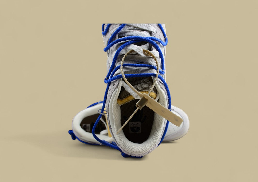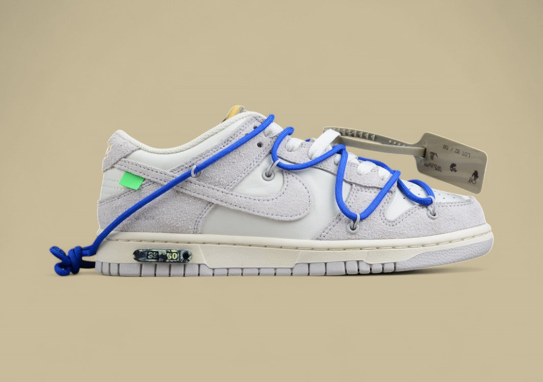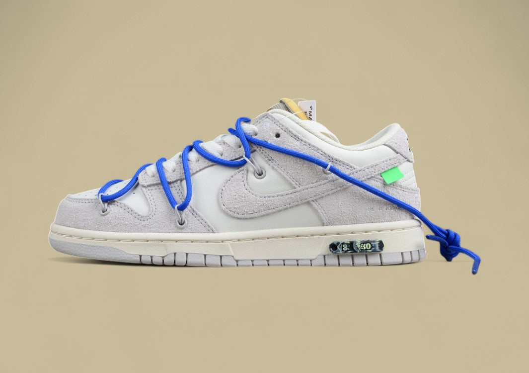 Der Nike SB Dunk Low Off-White “32 of 50” ist eine stilvolle Replika aus Virgil Ablohs gefeierter “The 50”-Kollektion – eine Hommage an kreatives Design und moderne Sneaker-Kultur. Diese Version besticht durch eine elegante Materialkombination aus weichem grauem Wildleder und glattem Leder, ergänzt durch Akzente in leuchtendem Blau. Besonders auffällig ist das charakteristische Off-White-Zugkordel-Schnürsystem in kräftigem Blau, das sich über das klassische Schnürsystem legt und dem Sneaker seinen markanten Look verleiht. Weitere ikonische Details wie die orangefarbene Zip-Tie, Helvetica-Schriftzüge auf der Innenseite und die Metallplakette mit der Nummer “32 of 50” unterstreichen den exklusiven Sammlercharakter. Freiliegende Schaumstoffdetails, offene Zunge und transparente Overlays verleihen dem Schuh die typische dekonstruierte Ästhetik von Off-White. Diese Replika verbindet Stil, Funktion und Sammlerwert – perfekt für alle, die Kunst und Streetwear auf höchstem Niveau feiern.
