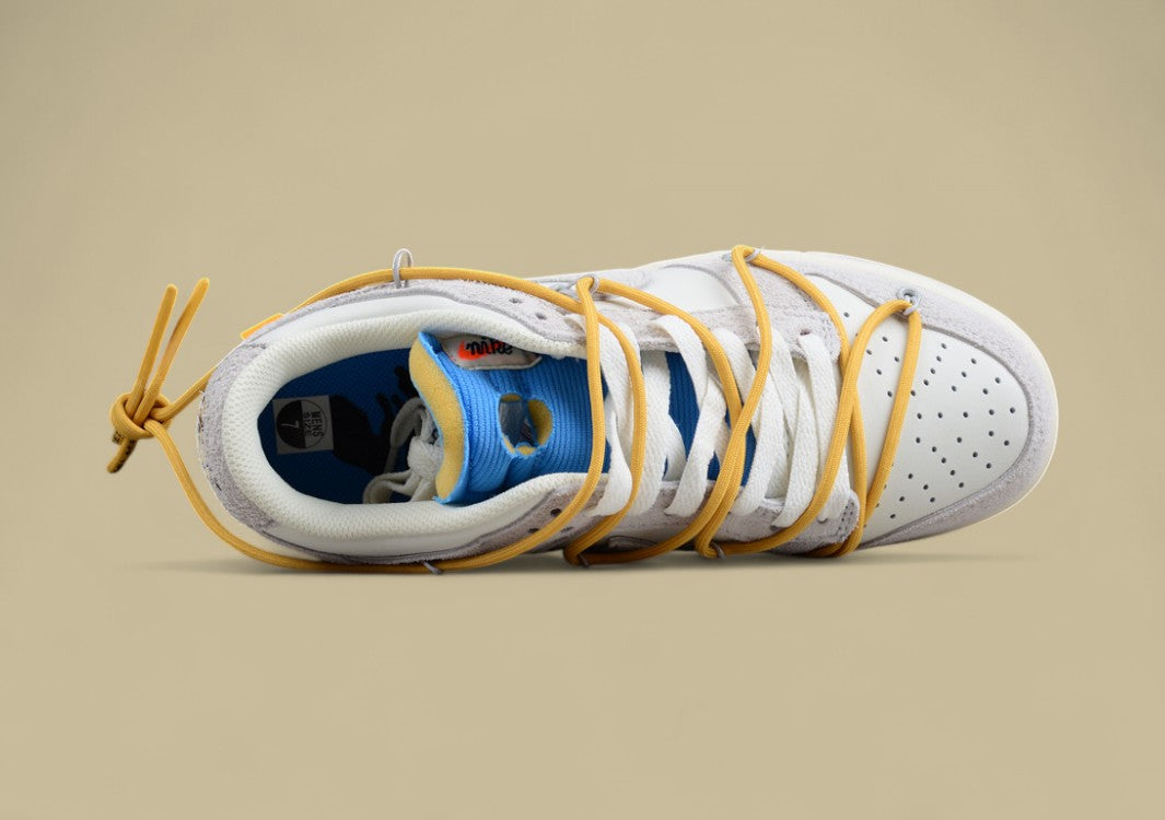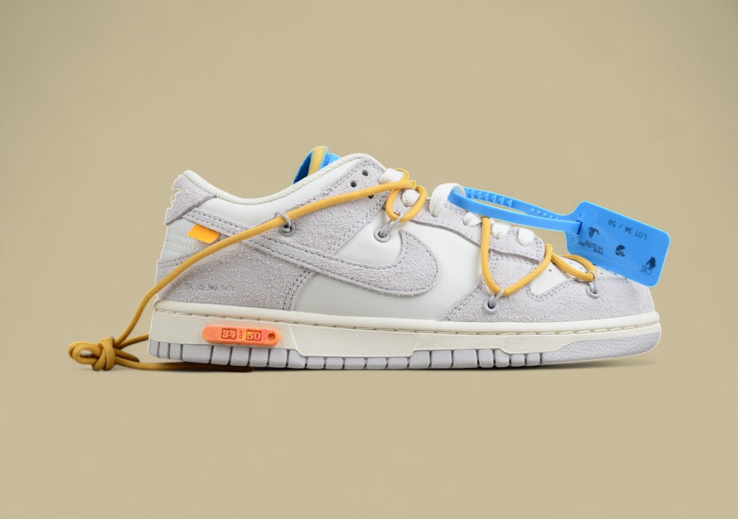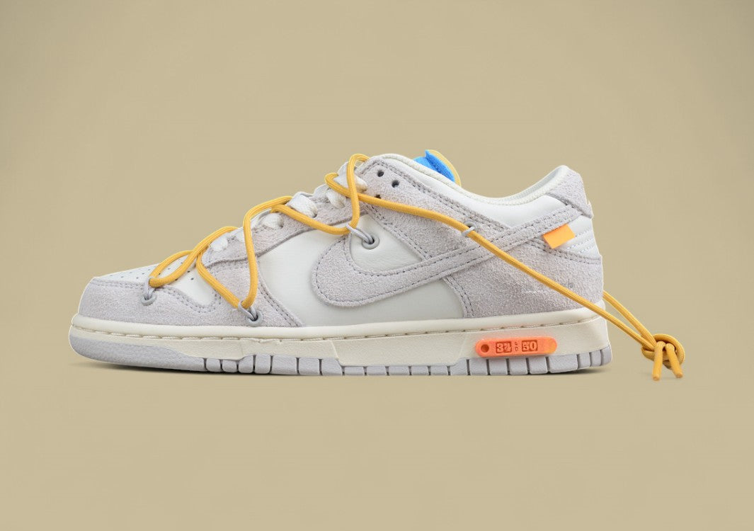 Der Nike SB Dunk Low Off-White “34 of 50” ist ein weiterer starker Vertreter aus der legendären “The 50”-Serie von Virgil Abloh – ein Design, das urbane Raffinesse mit ikonischer Streetwear-Ästhetik vereint. Diese Replika-Ausführung kombiniert edles graues Wildleder mit glattem Leder in Hellgrau und setzt auffällige Akzente durch leuchtend gelbe Zugkordel-Schnürsenkel, die quer über das traditionelle Schnürsystem verlaufen. Der charakteristische Off-White Zip-Tie in Orange, die typografischen Details im Inneren und die nummerierte Metallplakette “34 of 50” an der Außensohle machen diesen Sneaker zu einem unverkennbaren Sammlerstück. Freiliegende Schaumstoffelemente, offene Zunge und transparente Overlays unterstreichen den dekonstruieren Look, der Off-White so einzigartig macht. Die klassische SB Dunk Low Silhouette sorgt für Komfort, Stabilität und Style – auf dem Board oder im Alltag. Diese Replika ist die perfekte Wahl für alle, die Stilbewusstsein mit Sammlerleidenschaft verbinden.