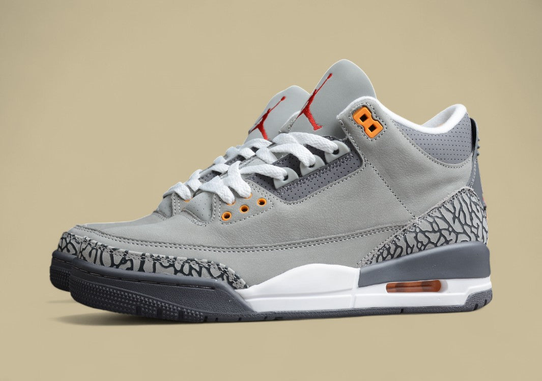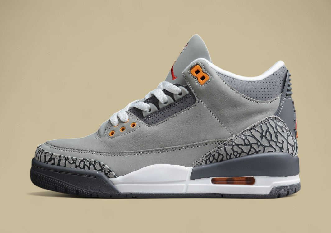 Der R38 Air Jordan 3 “Cool Grey” ist eine elegante Neuinterpretation des klassischen Jordan 3, die mit ihrer kühlen Farbgebung und hochwertigen Materialien überzeugt. Das Obermaterial besteht aus geschmeidigem Leder in verschiedenen Grautönen, wodurch der Schuh einen cleanen und modernen Look erhält. Charakteristische Details wie das Elefantenmuster an der Ferse und Zehenbox sind in dunklem Grau gehalten und sorgen für den typischen AJ3-Look. Auffällige orangefarbene und rote Akzente an den Ösen, am Jumpman-Logo und auf der Zunge setzen lebendige Kontraste und verleihen dem Sneaker frische Energie. Die weiße Zwischensohle mit sichtbarer Air-Dämpfung sorgt für exzellenten Komfort und rundet das sportliche Design funktional ab. Der “Cool Grey” bietet ein harmonisches Gleichgewicht aus Retro-Charme und modernem Stil – perfekt für den Alltag oder als Highlight in der Sneaker-Sammlung.