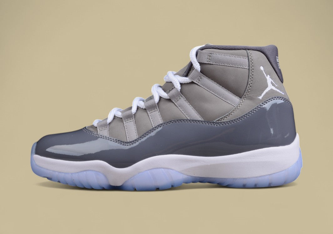 Die R45 Top Original Joe 11 Retro Basketballschuhe in „Gray and White Cool Gray“ sind eine hochwertige Replik des legendären Air Jordan 11 „Cool Grey“ – ein Klassiker, der Stil, Sportlichkeit und Komfort vereint. Das Obermaterial besteht aus glattem, hellgrauem Nubukleder und wird durch glänzendes, graues Lackleder ergänzt, das für einen eleganten und zugleich athletischen Look sorgt. Die weiße Zwischensohle bringt visuelle Klarheit und hebt die charakteristische Silhouette hervor, während die halbtransparente, eisblaue Außensohle den Sneaker modern und frisch abrundet. Typische Designelemente wie das gestickte Jumpman-Logo und das „23“ auf der Ferse sorgen für authentischen Retro-Charme. Die Innensohle ist weich gepolstert, während die solide Sohle mit eingebauter Dämpfung für Stabilität, Tragekomfort und Performance sorgt – perfekt für den Alltag, Streetstyle oder den Basketball-Court.