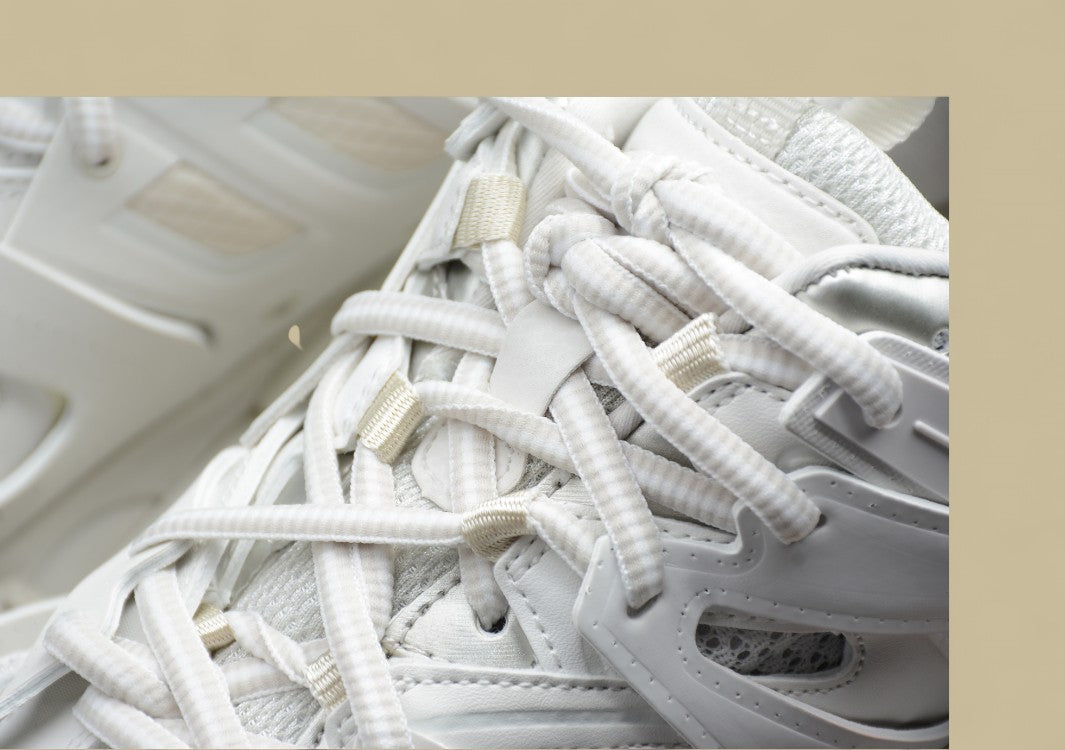 Der Balenciaga R58 GZ-Version "White Taillight" Sneaker ist eine hochwertige Replik, die das ikonische Design des Originals detailgetreu nachbildet. Das Obermaterial aus atmungsaktivem Mesh und synthetischem Leder sorgt für optimalen Komfort und Langlebigkeit. Die auffällige weiße Farbgebung wird durch fluoreszierende Akzente an der Ferse ergänzt, die dem Sneaker einen modernen, dynamischen Look verleihen. Die mehrschichtige, profilierte Sohle bietet hervorragende Dämpfung und Stabilität, ideal für den urbanen Alltag. Das dezente Balenciaga-Branding rundet das Design ab und unterstreicht den luxuriösen Anspruch dieses Sneakers.