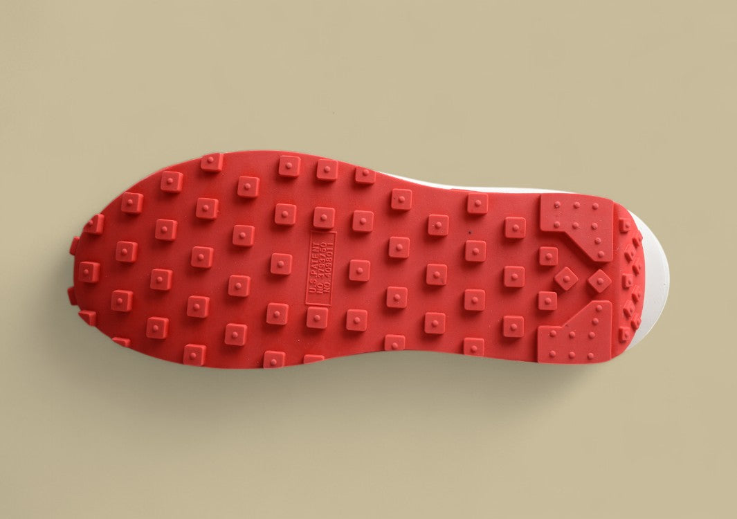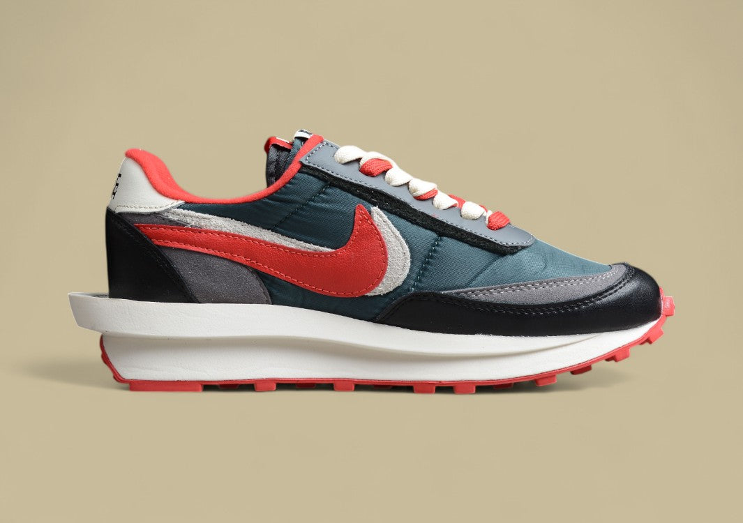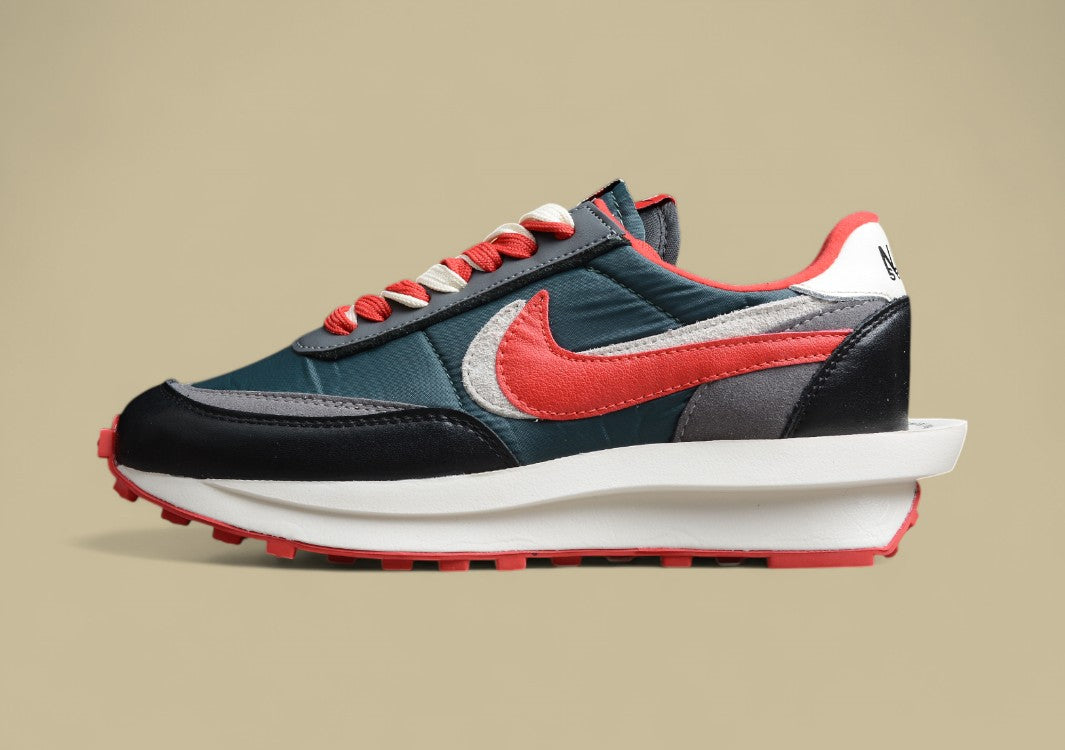 Tiefgrüner Sneaker mit roten Akzenten und Sacais ikonischem Doppel-Look.Fusion aus klassischem Nike-Stil, Sacais innovativer Ästhetik und Undercover's avantgardistischem Design.