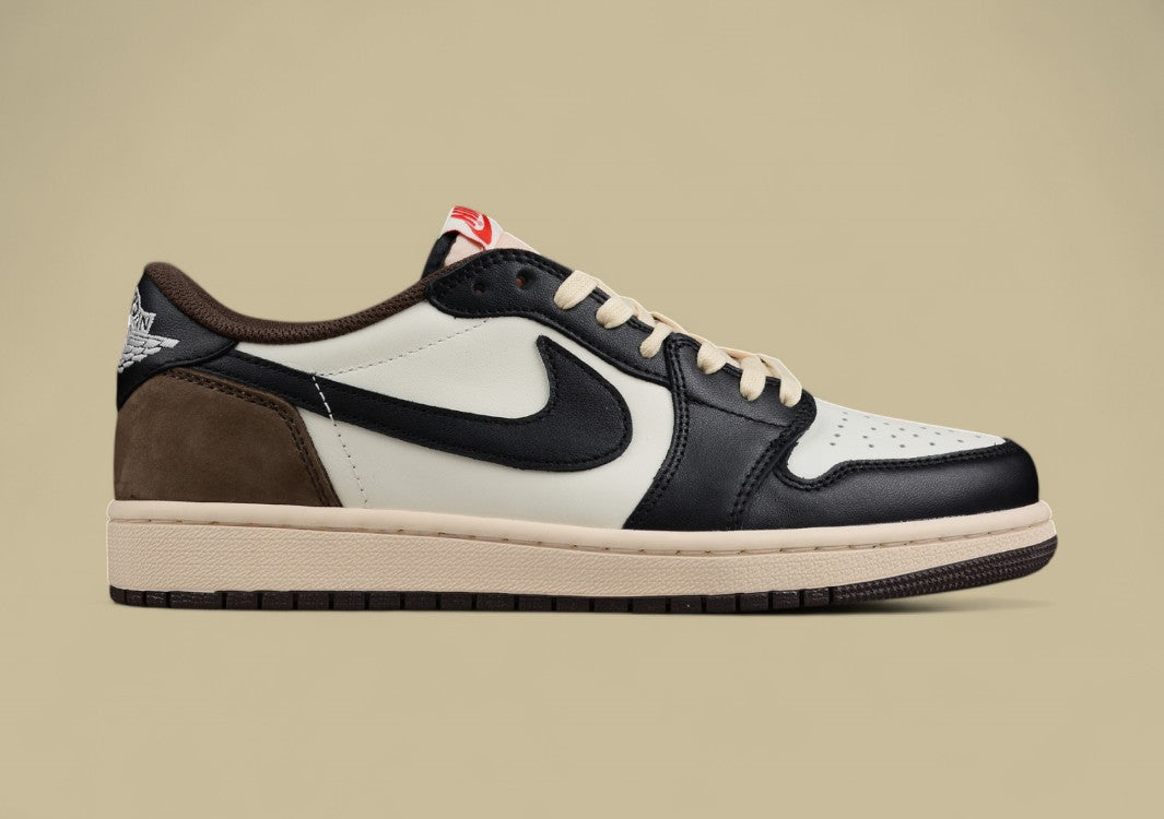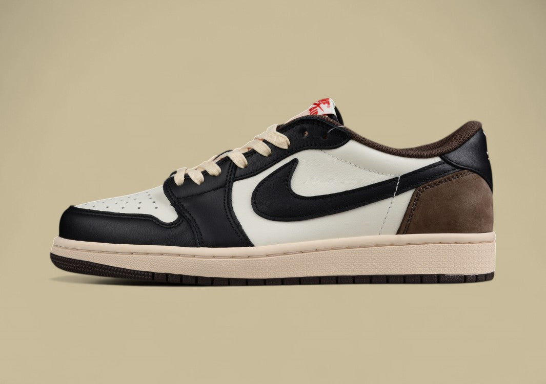 Dark Mocha Travis Scott Jordan 1 Low mit kleinem Cactus Jack Branding. Klassischer Look trifft auf ikonisches Travis-Design in edlem Braun.