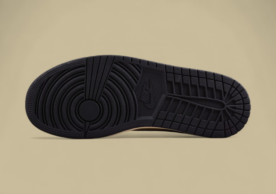 Markanter Jordan 1 Low mit Travis Scotts Handschrift. Schwarze Details und „Cactus Jack“-Branding im Fokus.