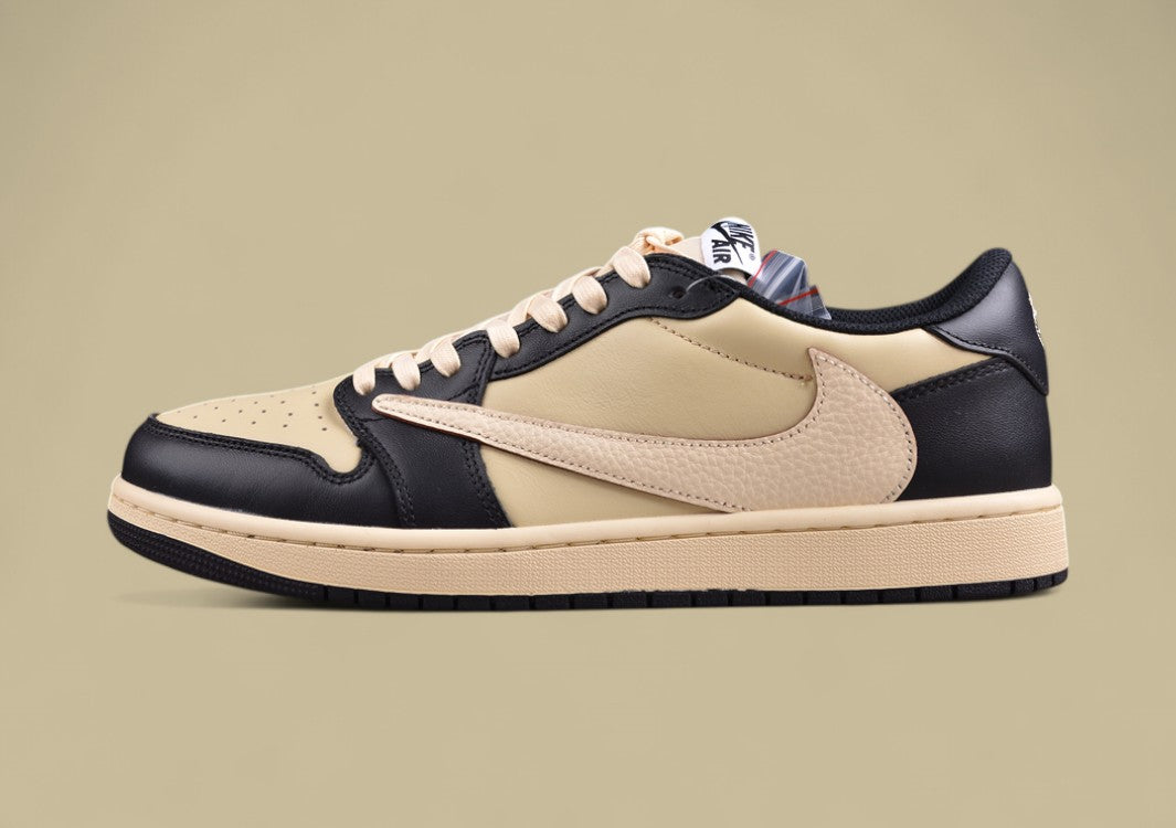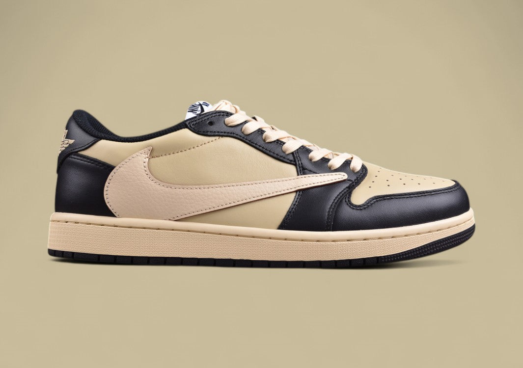 Der Travis Scott x Air Jordan 1 Low Black Tan Reps bringt den ikonischen Stil des Rappers in eine elegante, kontrastreiche Farbkombination. Das Obermaterial besteht aus hochwertigem Leder in edlem Creme und tiefem Schwarz, das durch den rückwärts gerichteten Swoosh sofort ins Auge fällt. Das eingestickte „Cactus Jack“-Branding an der Seite sorgt für den charakteristischen Travis-Look. Die farblich abgestimmten Schnürsenkel und die cremefarbene Mittelsohle harmonieren perfekt mit dem restlichen Design, während die schwarze Gummisohle für sicheren Halt und Langlebigkeit sorgt. Ein Must-Have für Sneakerheads und Fans von auffälligem Streetstyle.