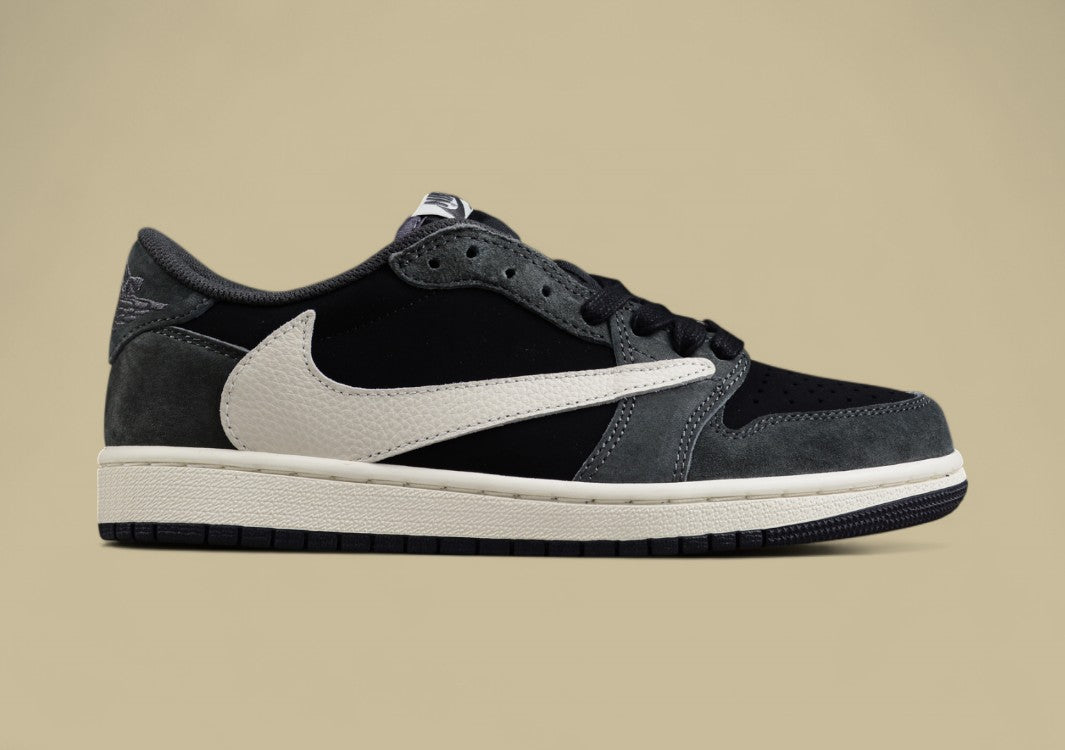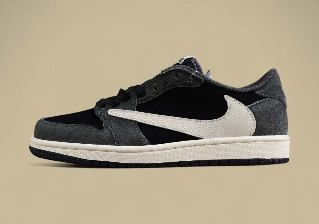 Schwarz trifft auf Weiß – Travis Scott verleiht dem AJ1 Low mit umgekehrtem Swoosh und persönlichen Details einen modernen, eleganten Look.