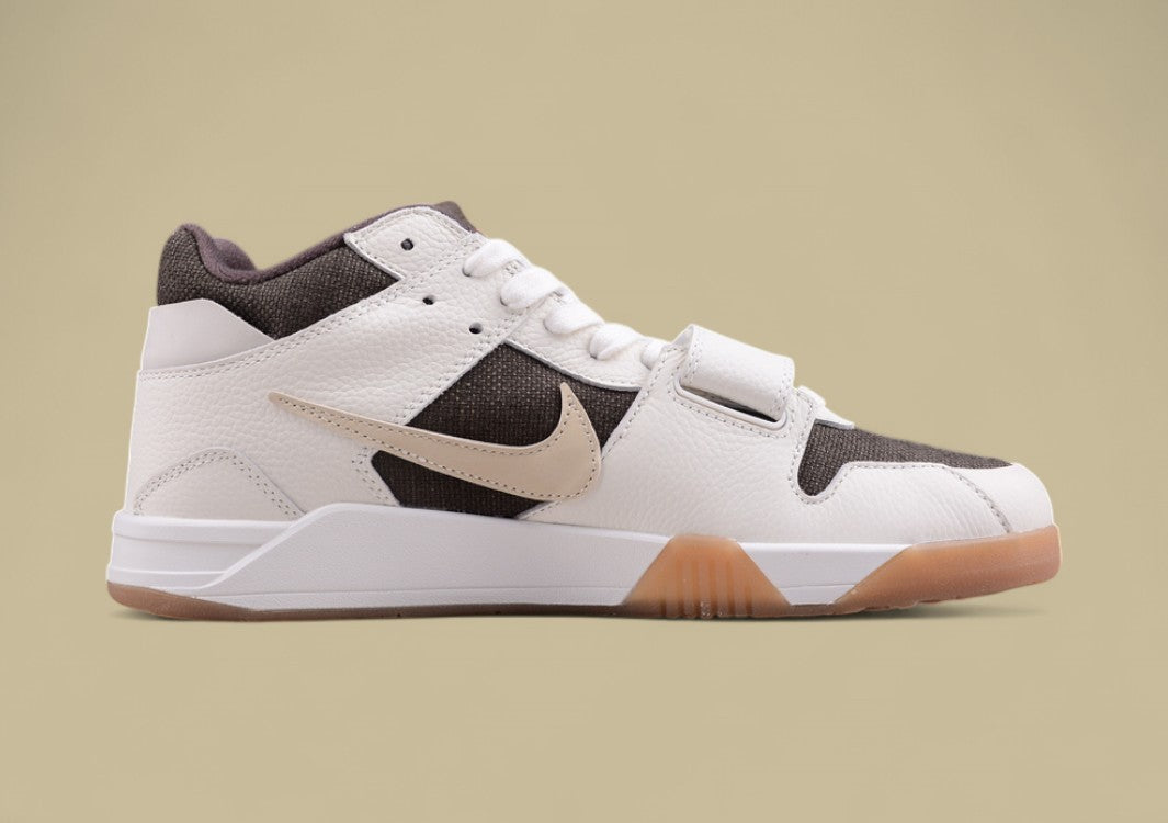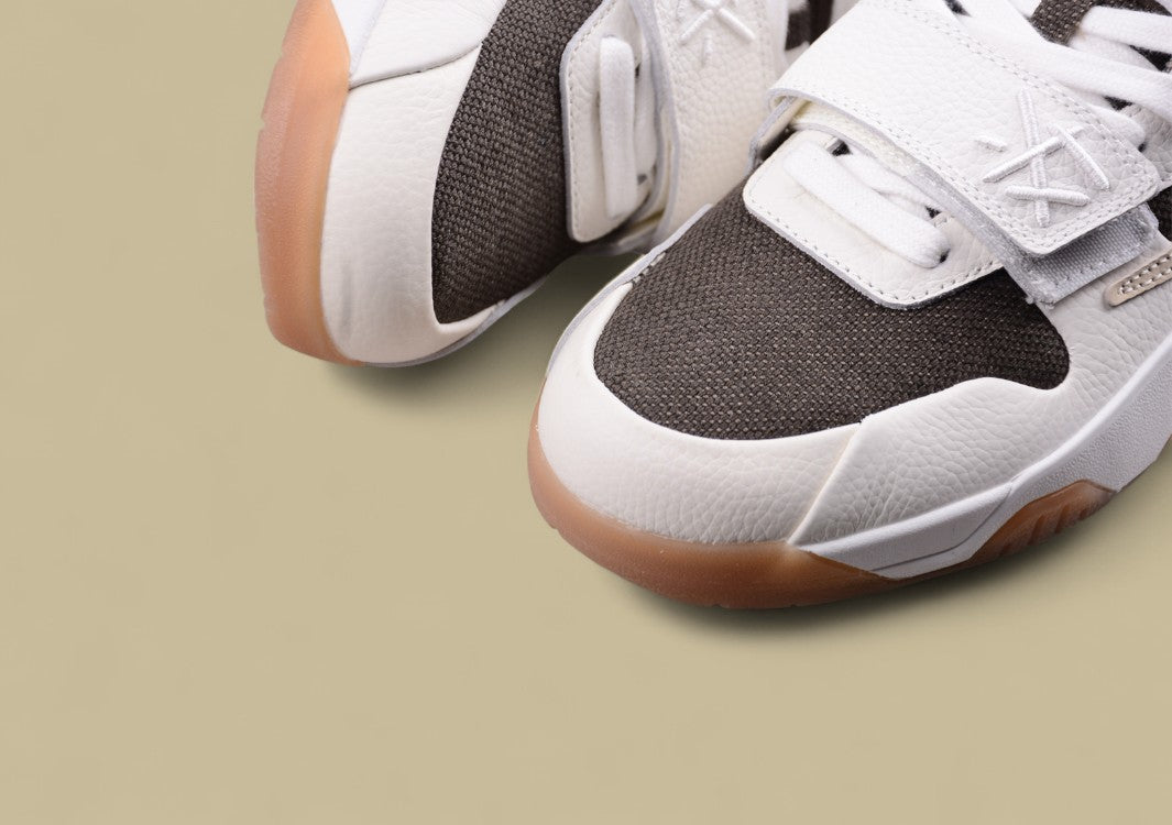 Der Travis Scott x Jordan Jumpman Jack TR „University Red“ ist ein energiegeladener Performance-Sneaker, der sportliche Funktion mit Travis’ charakteristischem Stil vereint. Das Obermaterial besteht aus einer Kombination aus robustem Textil und Leder, überwiegend in Off-White gehalten, akzentuiert durch kräftige University Red-Highlights. Der auffällige, rückwärts gerichtete Swoosh auf der Außenseite bleibt auch hier erhalten und sorgt für sofortigen Wiedererkennungswert. Ein verstellbarer Riemen über dem Mittelfuß bietet zusätzliche Stabilität und einen futuristischen Look. Die Außensohle mit multidirektionalem Grip wurde für Bewegung und Agilität konzipiert – ideal für Sport und Lifestyle. Cactus Jack-Branding und Jumpman-Details verschmelzen zu einem progressiven Design, das sowohl auf dem Court als auch auf der Straße überzeugt.