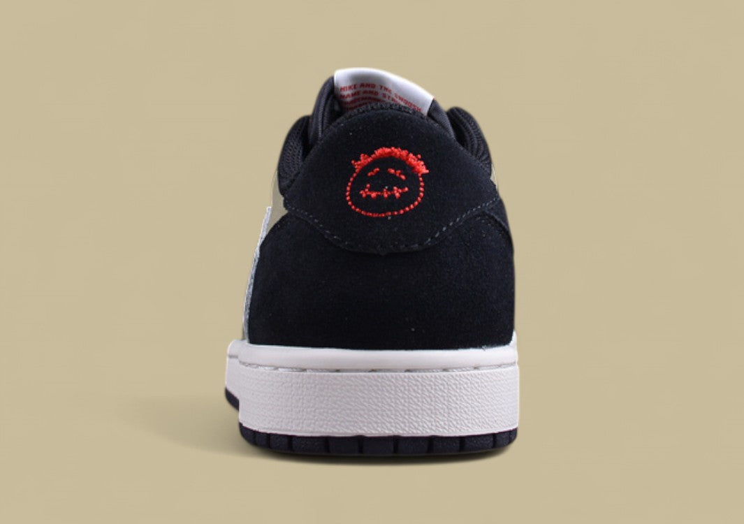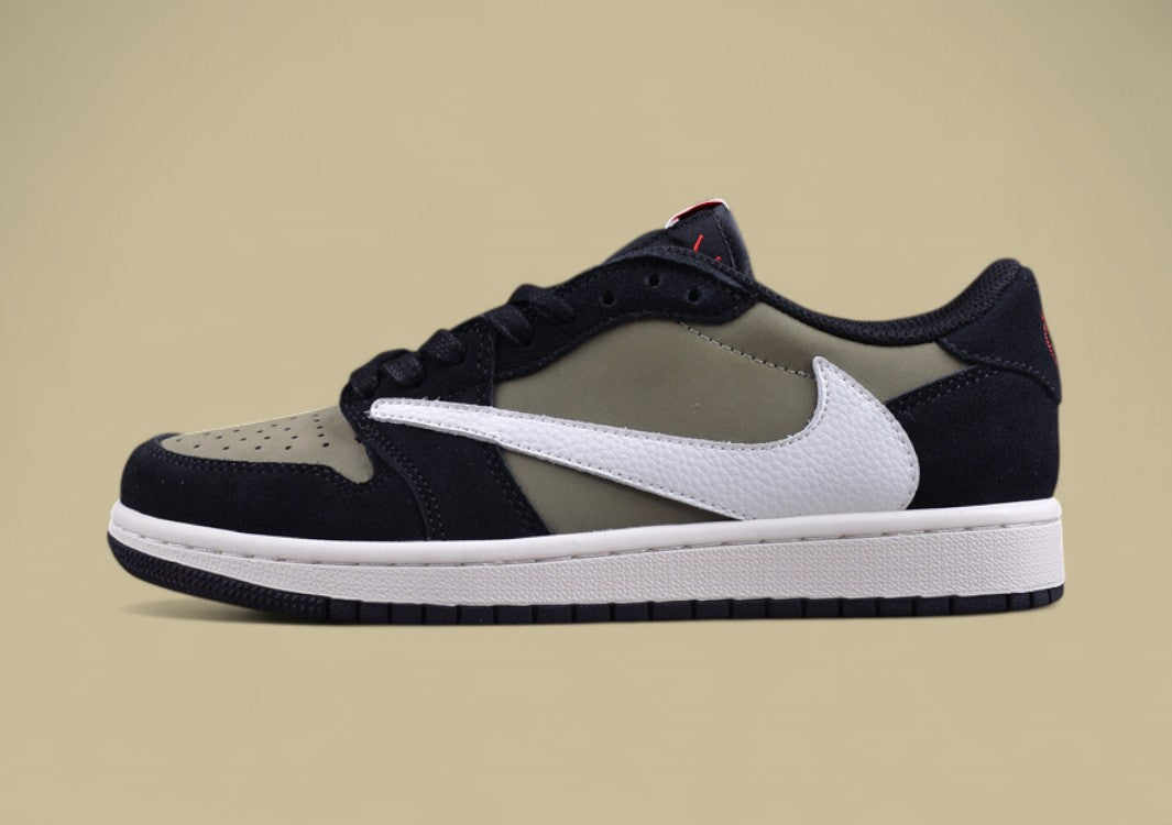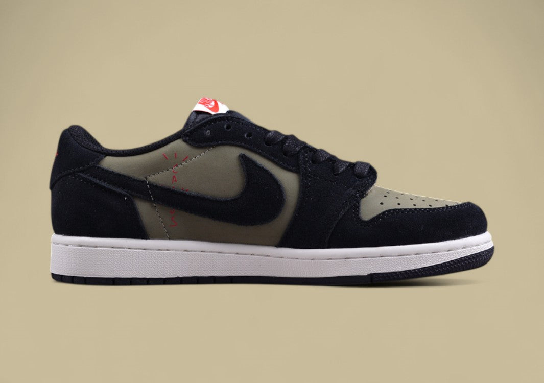 Olivgrüner Reverse-Swoosh trifft auf schwarzes Wildleder und Cactus Jack-Flair.Ein ikonischer Travis AJ1 Low mit edgy Streetwear-Vibes.