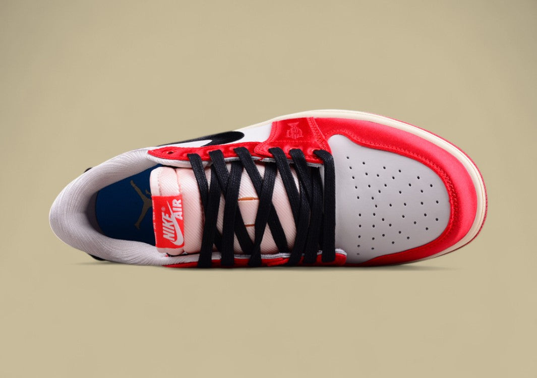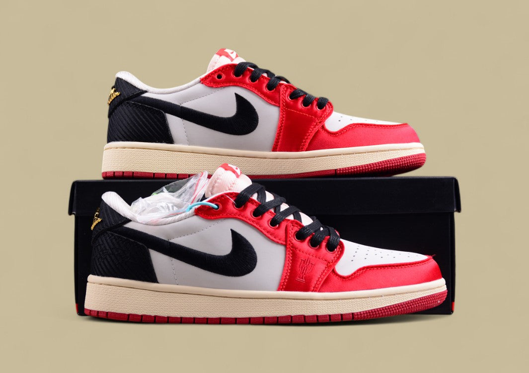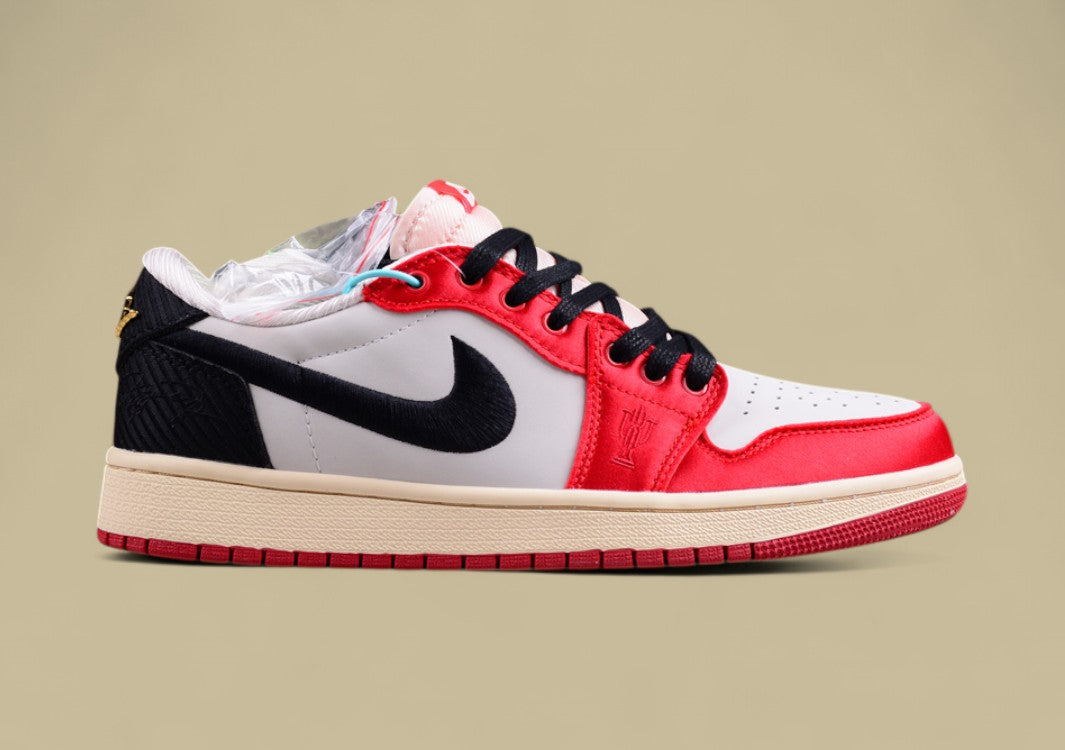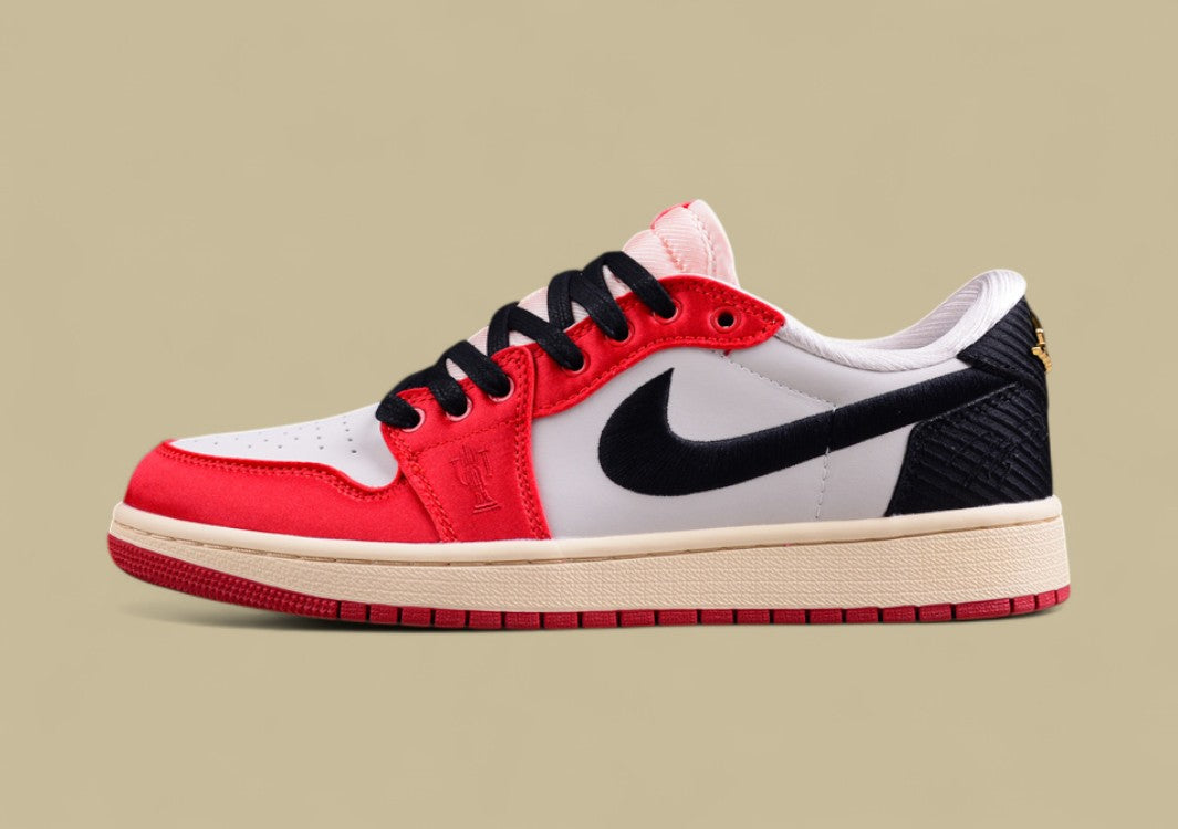 Eleganter Trophy Room x AJ1 Low in Auswärtsfarben mit goldenen Akzenten.Ein edles Sammlerstück mit sportlichem Erbe und limitierter Raffinesse.
