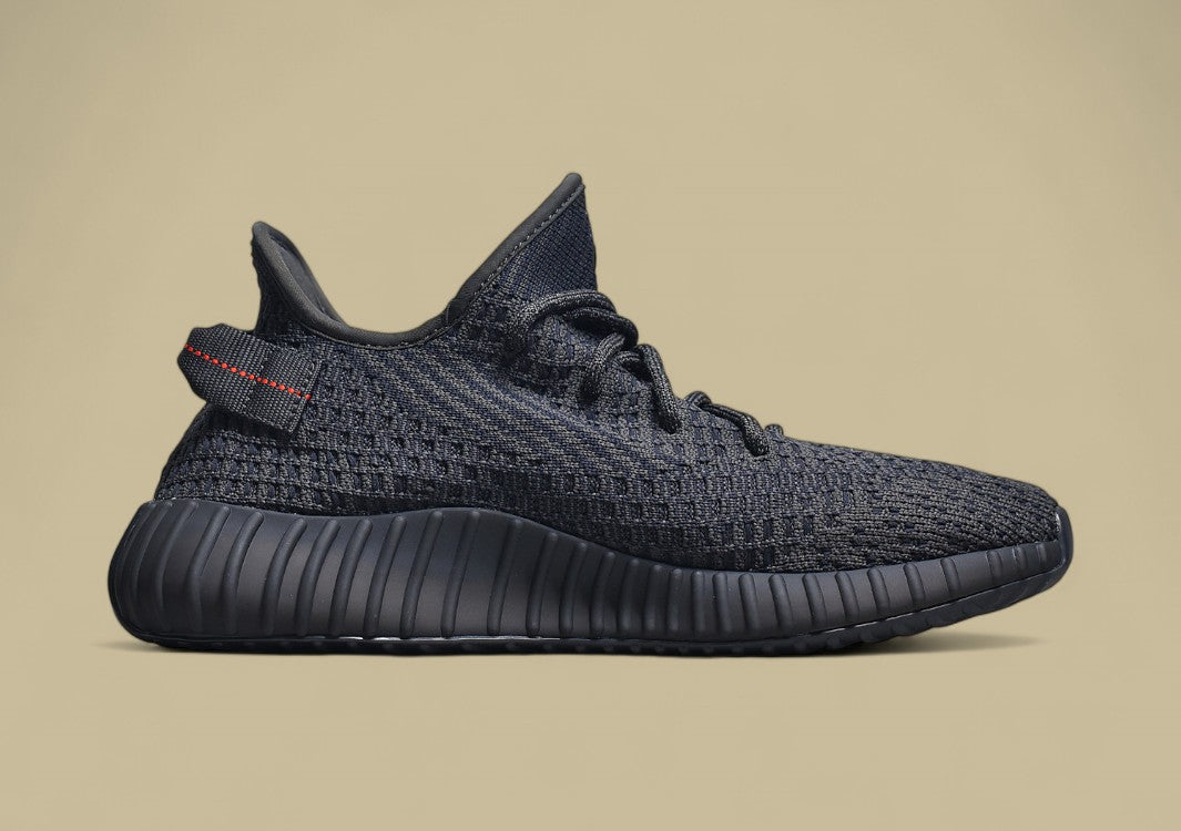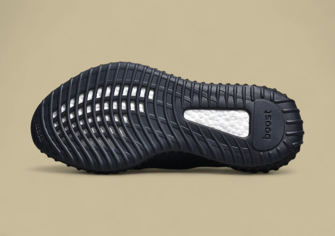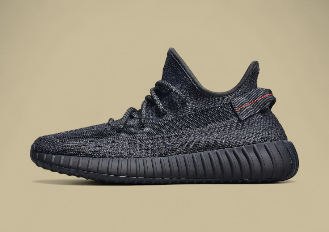 Monochromer schwarzer Yeezy Boost 350 V2 mit halbtransparenter Seitenstreifen-Applikation.Boost-Dämpfung und rotes Fersenklettverschluss-Detail für modernen Komfort.