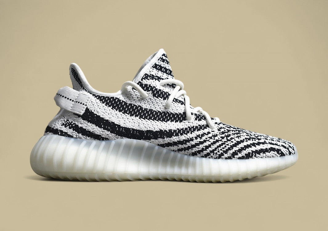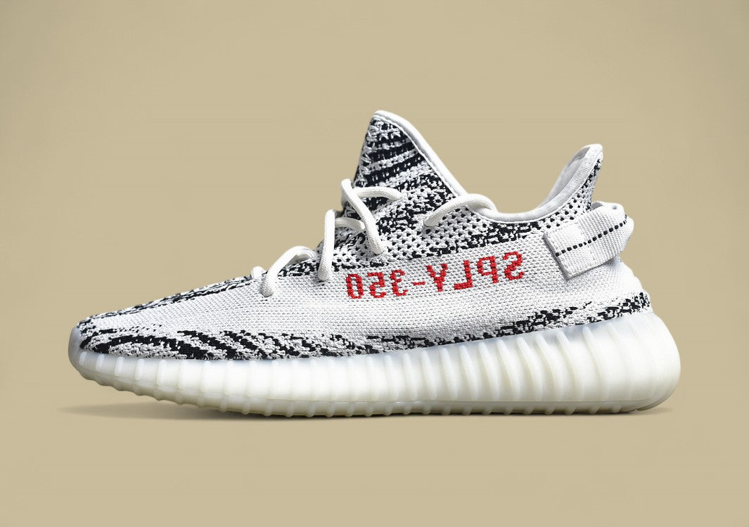 Weißer Yeezy Boost 350 V2 Zebra mit schwarzen Zebrastreifen und rotem "SPLY-350"-Schriftzug.Komfortabel, stylisch und leistungsstark für den Alltag.