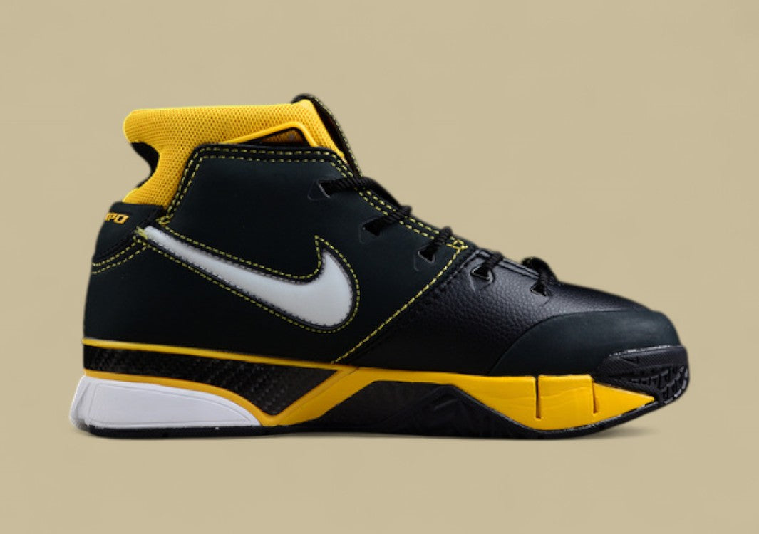 Kobe 1 Protro "Del Sol" in Schwarz mit weißen und gelben Details – klassisch und kraftvoll.Modernisierte Performance trifft auf ikonisches Design.
